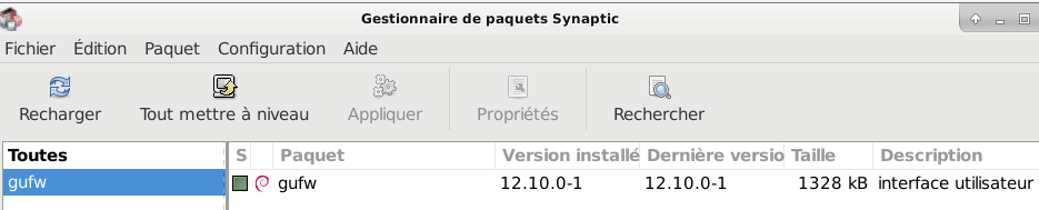 Si le paquet gufw (interface graphique du pare feu ufw) n'est pas installé, il suffit de le faire par le gestionnaire de paquets Synaptic, le Terminal ou éventuellement l'outil spécifique présent dans votre distribution.