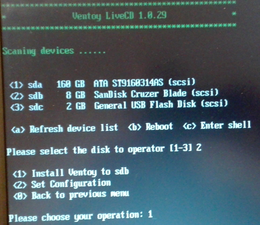 - Dans cet exemple, la clé “multi démarrage” est de marque SanDisk et d'une capacité de 8 Go (sdb) Pour la sélectionner, il suffit de taper sur la touche 2. Puis Installer Ventoy sur sdb en tapant sur la touche 1.