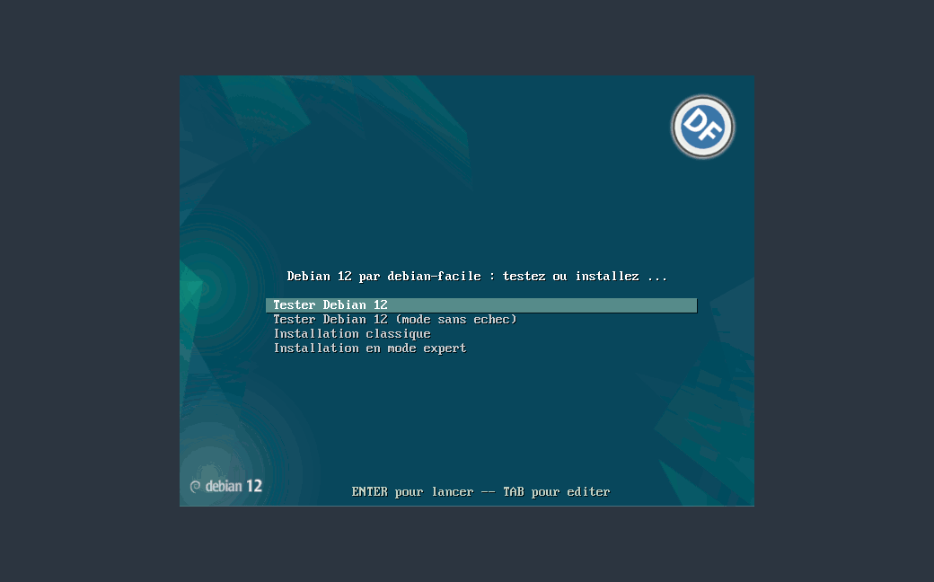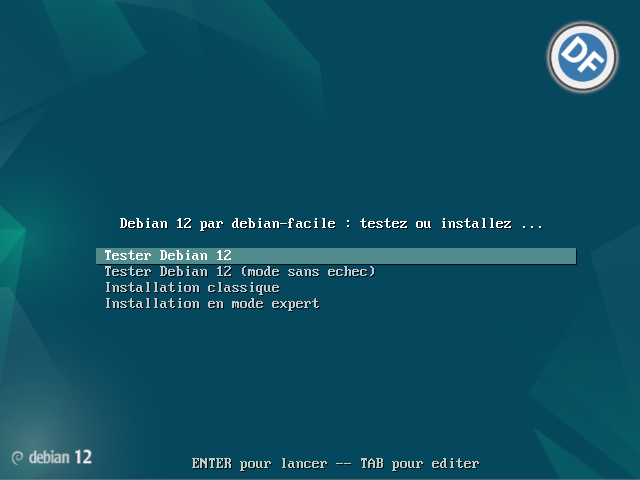 Pour tester la compatibilité de votre matériel ou simplement découvrir votre environnement avant de l’installer, sélectionnez l’entrée “Tester Debian”.