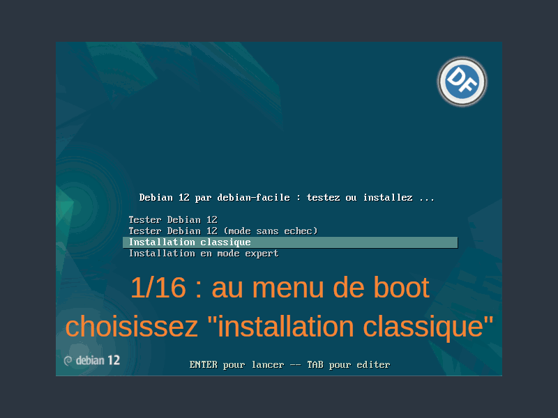 Ce mode d’installation détaille l’intégralité du processus et des options disponibles. Il est prévu pour les utilisateurs avertis souhaitant faire découvrir Debian facilement, tout en contrôlant l’intégralité de l’installation.