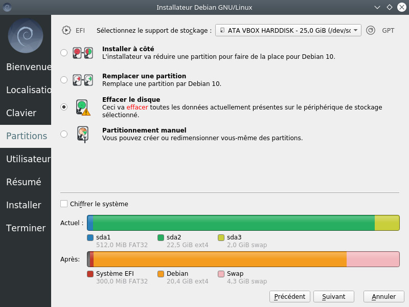 L’onglet Partitions est le plus important car il va vous permettre de modifier l’agencement du ou des disques durs de votre ordinateur : à utiliser avec précaution. Pour une installation en single boot (Debian sera le seul système sur la machine), vous pouvez choisir “Effacer le disque”. Pour une installation en dual boot (à côté d’un autre système), choisissez “Installer à côté”. Dans le doute, posez la question sur le forum.