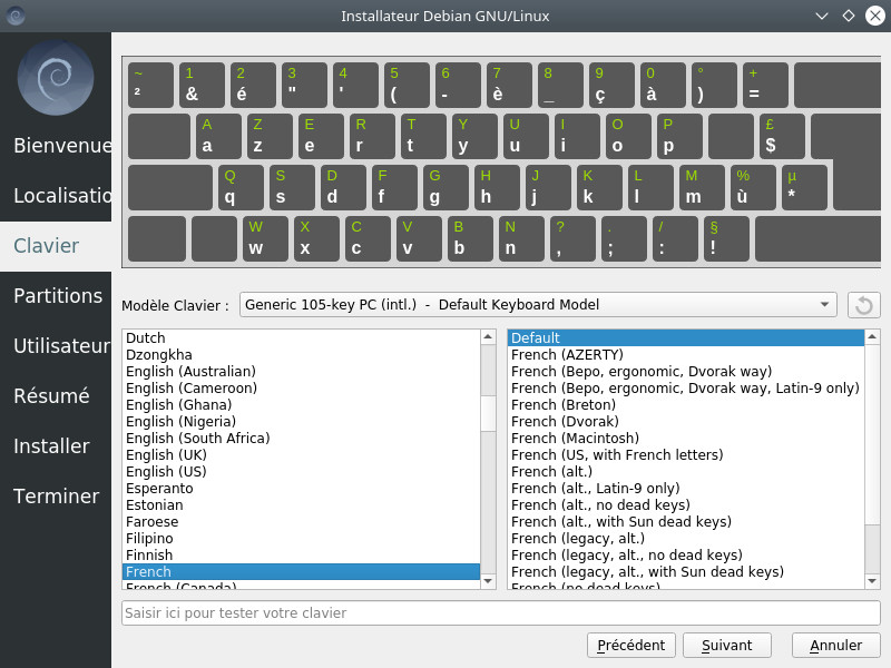 L’onglet Clavier est très (trop?) complet… dans le doute, choisissez le clavier par défaut, vous pourrez toujours le modifier après l’installation.
