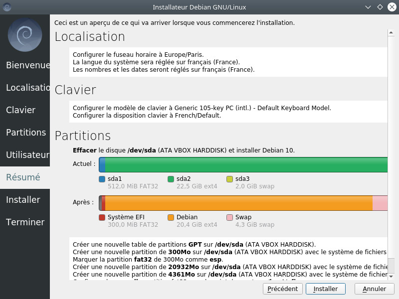 L’onglet Résumé porte bien son nom… prenez quelques instants pour vérifier les informations fournies car une fois que vous aurez cliqué sur “Installer”, le formatage des partitions commencera. En cas d’erreur, vous pouvez encore revenir en arrière avec le bouton “Précédent”.