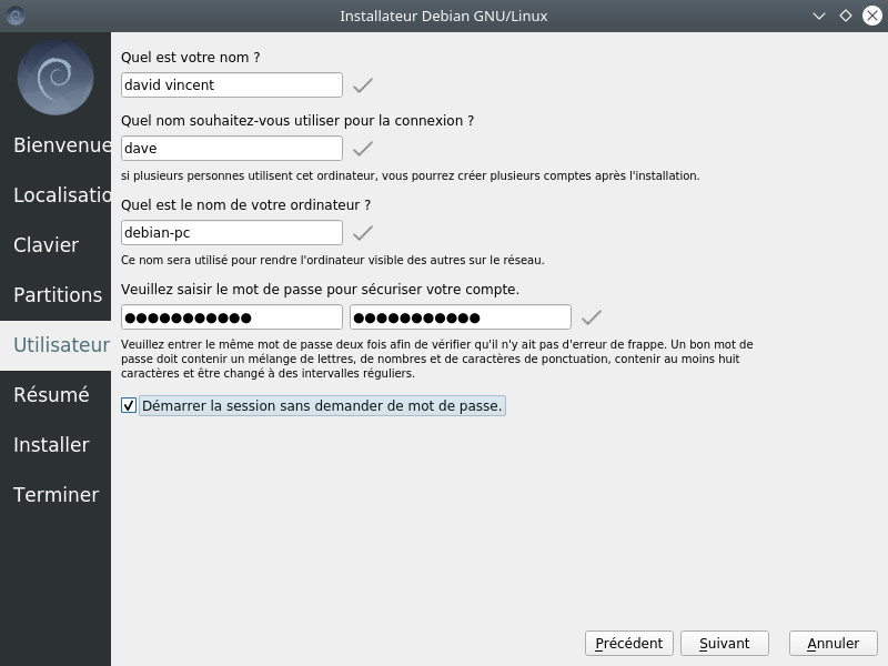L’onglet Utilisateur vous permettra de définir votre identité sur cette machine. Votre nom complet, votre identifiant de connexion et votre mot de passe. Vous pourrez également activer la connexion automatique (sans mot de passe) pour votre utilisateur.