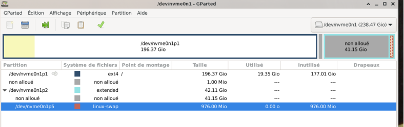 Une fois le swap désactivé, vous pouvez voir que les petites clés ont disparus sur nvme0n1p2 et nvme0n1p5