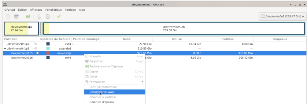 la première chose à faire sera de désactiver le swap ensuite on supprimera la partition nvme0n1p6 qui n’est pas montée