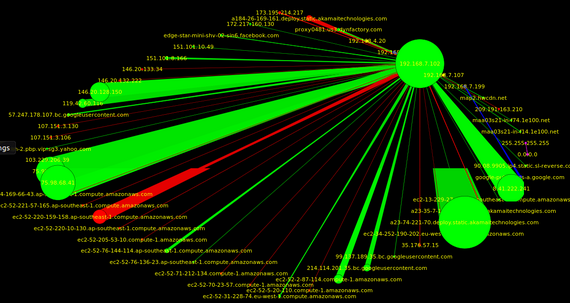 Chaque transfert de données est représenté par un trait ainsi qu’un disque de couleur au point d’origine. Les protocoles sont représentés par des couleurs différentes et plus le transfert n’est important plus le disque et le trait sont grands.