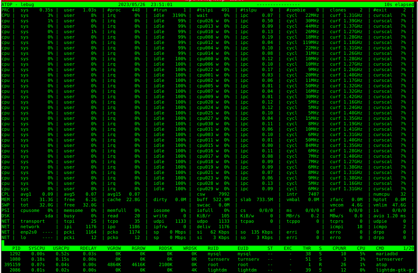 atop est un outil en ligne de commandes interactif pour la supervision de performance sur des systèmes basés sur Linux Vous pouvez récupérer des capacités d'utilisation pour le CPU, la consommation de mémoire et les I/O disque, pour chaque processus et thread.