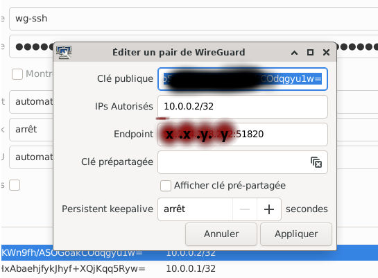 # nom du serveur [Peer] Endpoint = 99.xxx.188.xxx:51820 PublicKey = celle du serveur AllowedIPs = 10.0.0.2/32