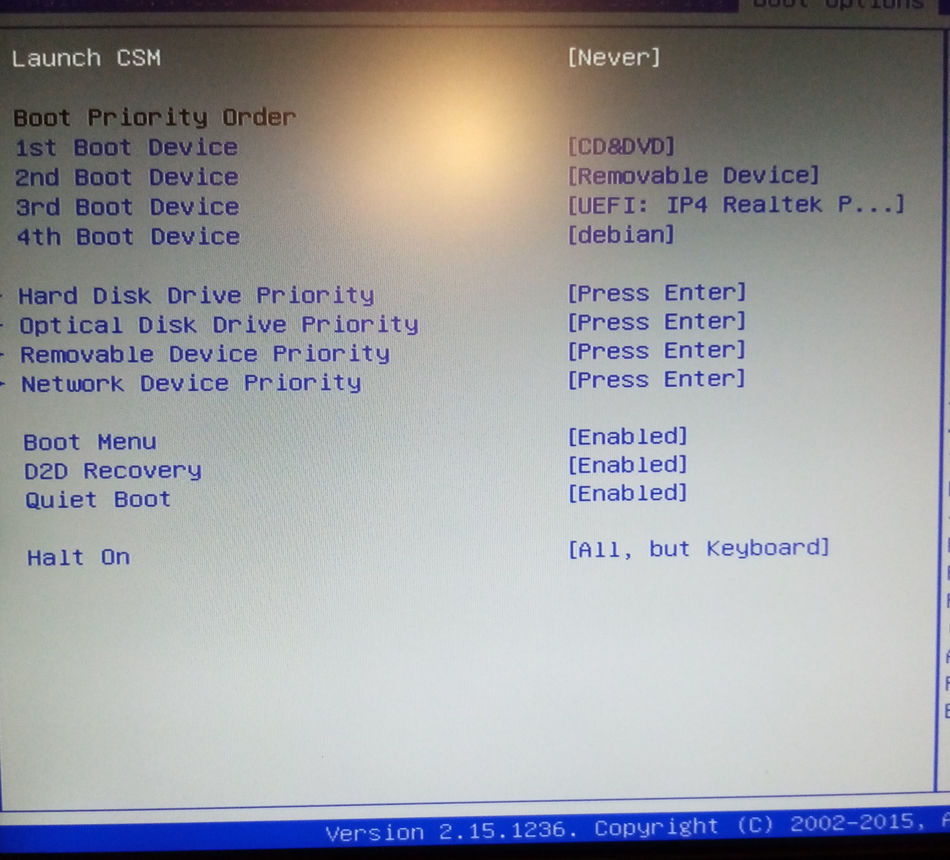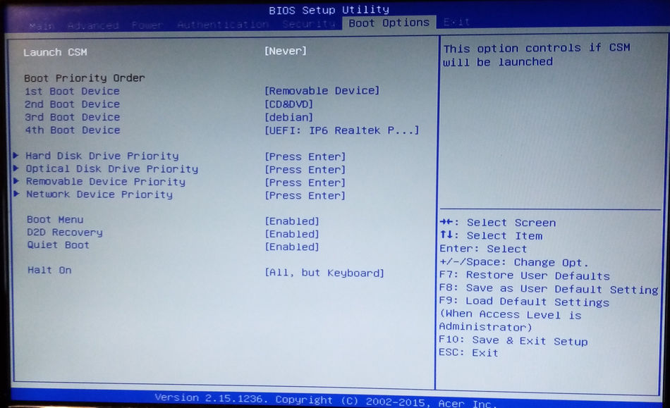 De plus les options UEFI par défaut conviennent parfaitement pour installer Débian sur le PC fixe ACER TC-705.