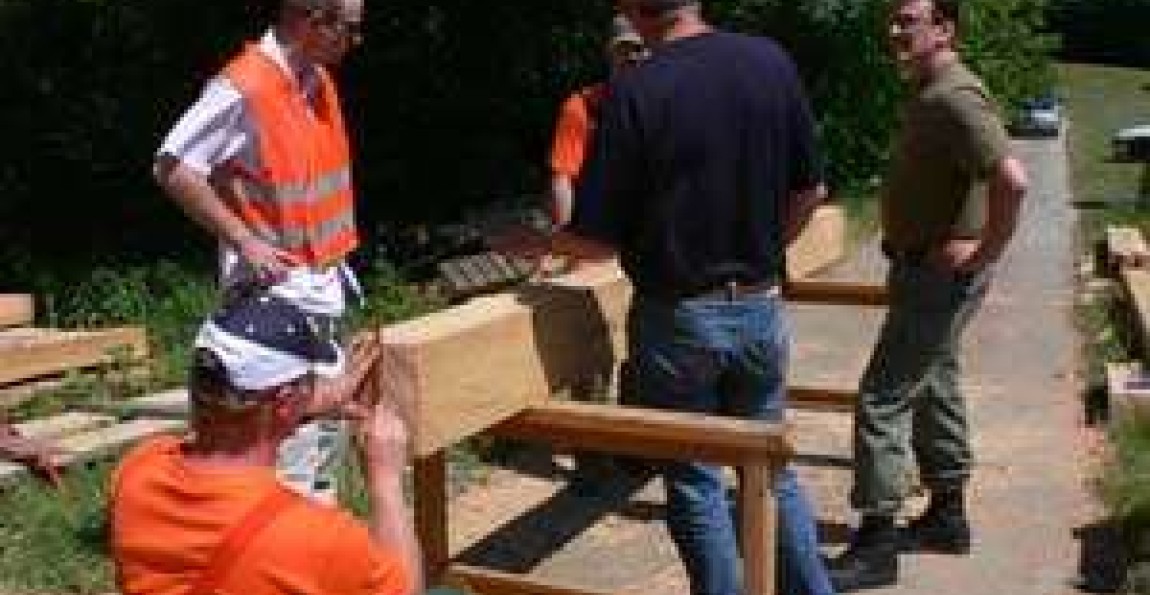 Huit années ont passé et les planches du pont suspendu doivent être changées. Sur mandat communal, la Protection civile a été remobilisée. Le remplacement des poutres et des planches occupe actuellement 6 personnes. La durée des travaux est estimée à 1 semaine. Comme lors de sa construction, la question de la sécurité est au centre des préoccupations du Cdt Edmond Pasquier. Les hommes à pied d'oeuvre sont presque tous des professionnels des métiers du bois et de la construction.