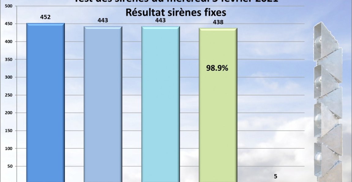 Le test annuel des sirènes s'est déroulé le mercredi 3 février 2021. Les résultats du test sur le canton de Vaud, qui a porté uniquement sur le déclenchement à distance, confirment le bon fonctionnement des sirènes à 98.9%.