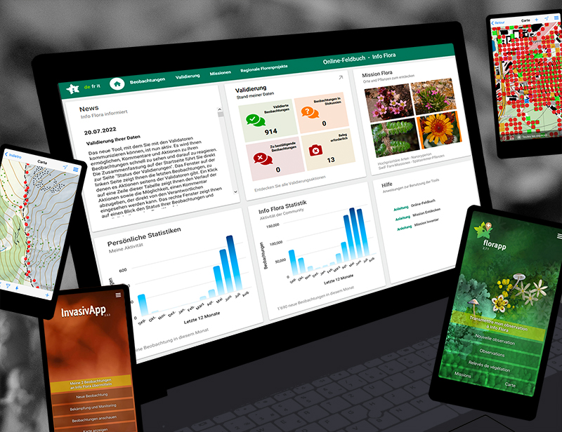 Le Carnet en ligne est l‘outil de saisie par défaut pour transmettre vos observations à InfoFlora. Un carnet en ligne spécialement dédié aux néophytes envahissants est aussi disponible.